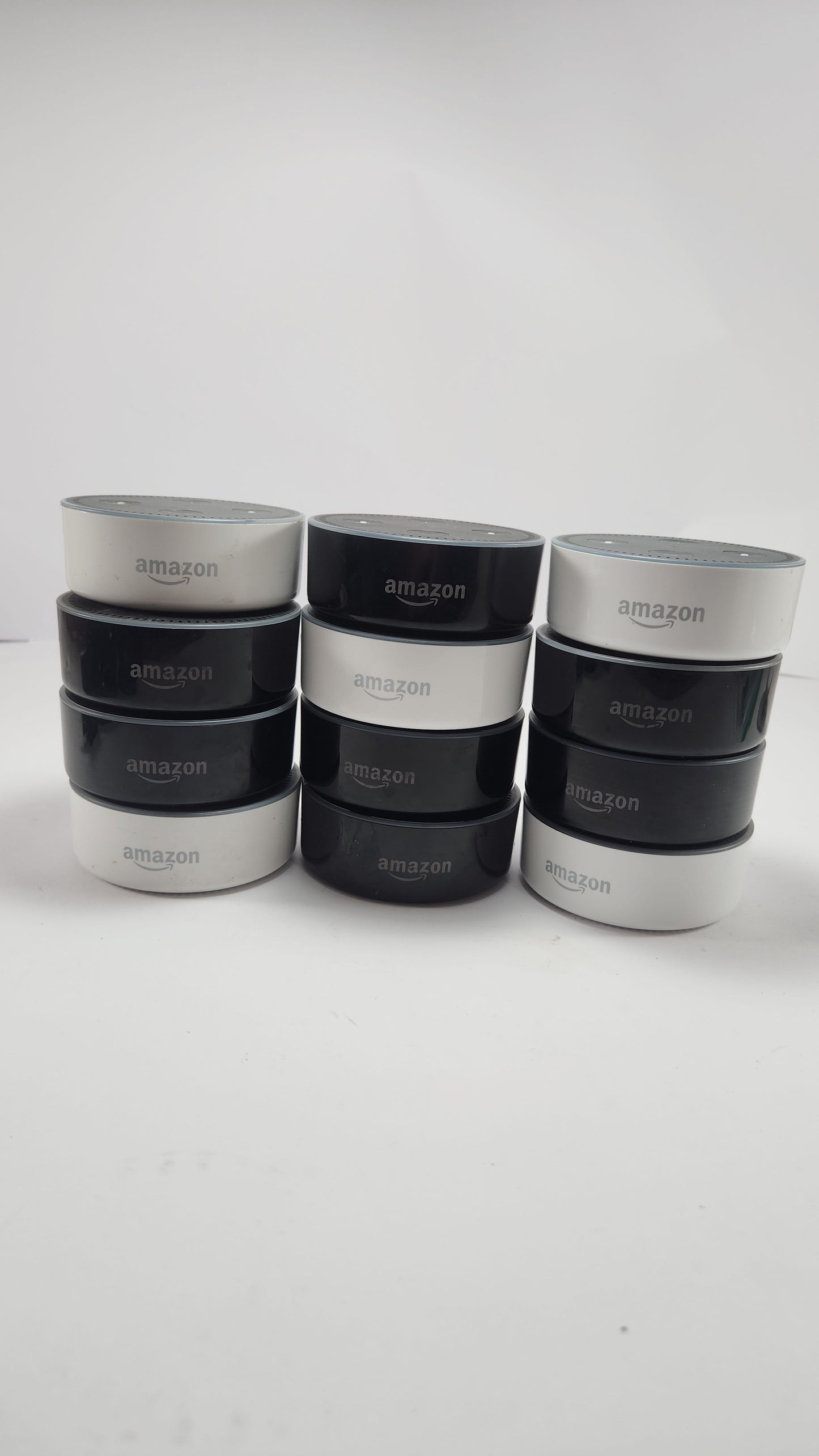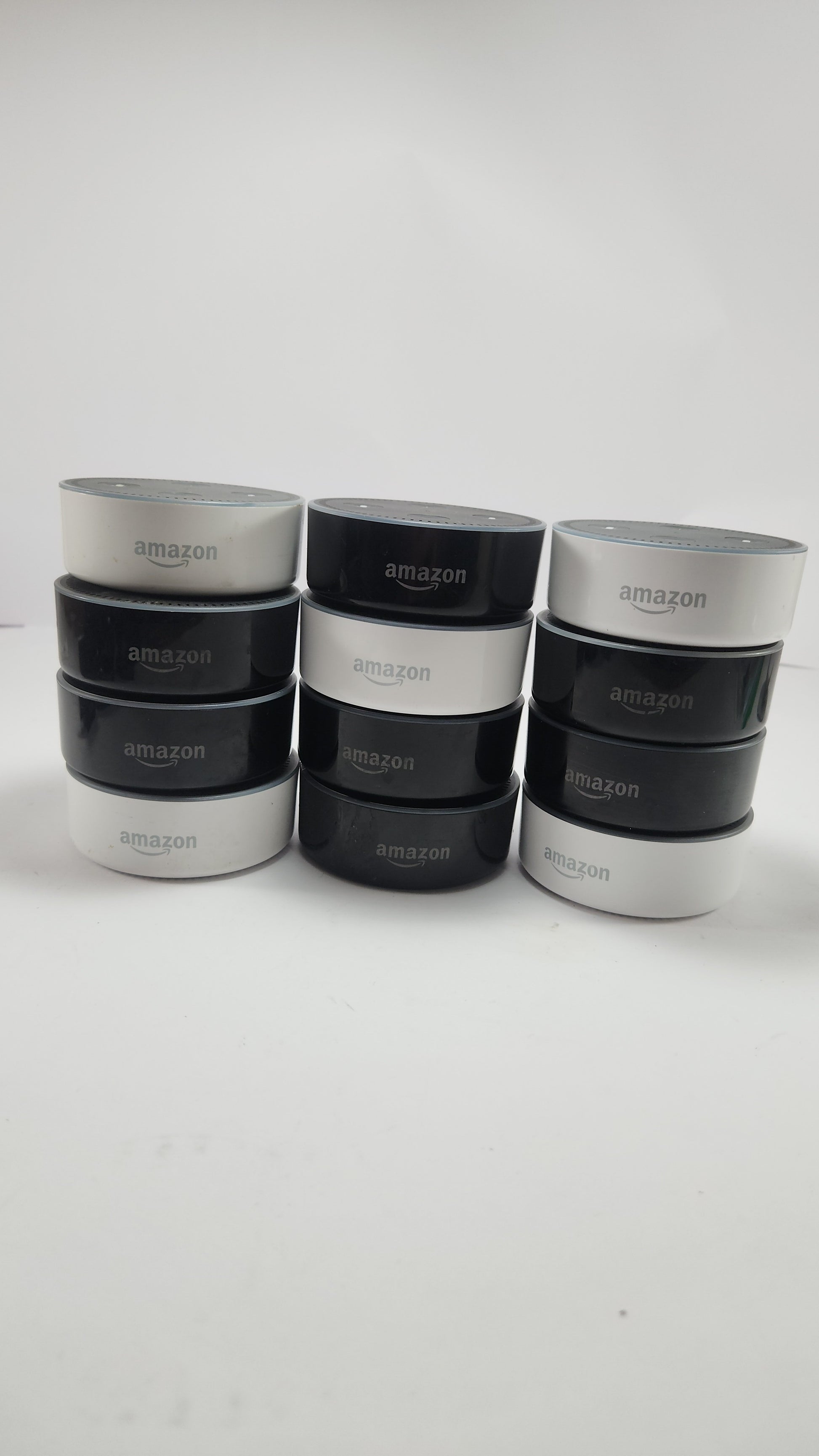 Bocinas inteligentes Amazon Echo Dot de 2da generación, disponibles en color negro y blanco. Integran Alexa para reproducir música, controlar dispositivos inteligentes, responder preguntas, configurar alarmas y mucho más con comandos de voz.