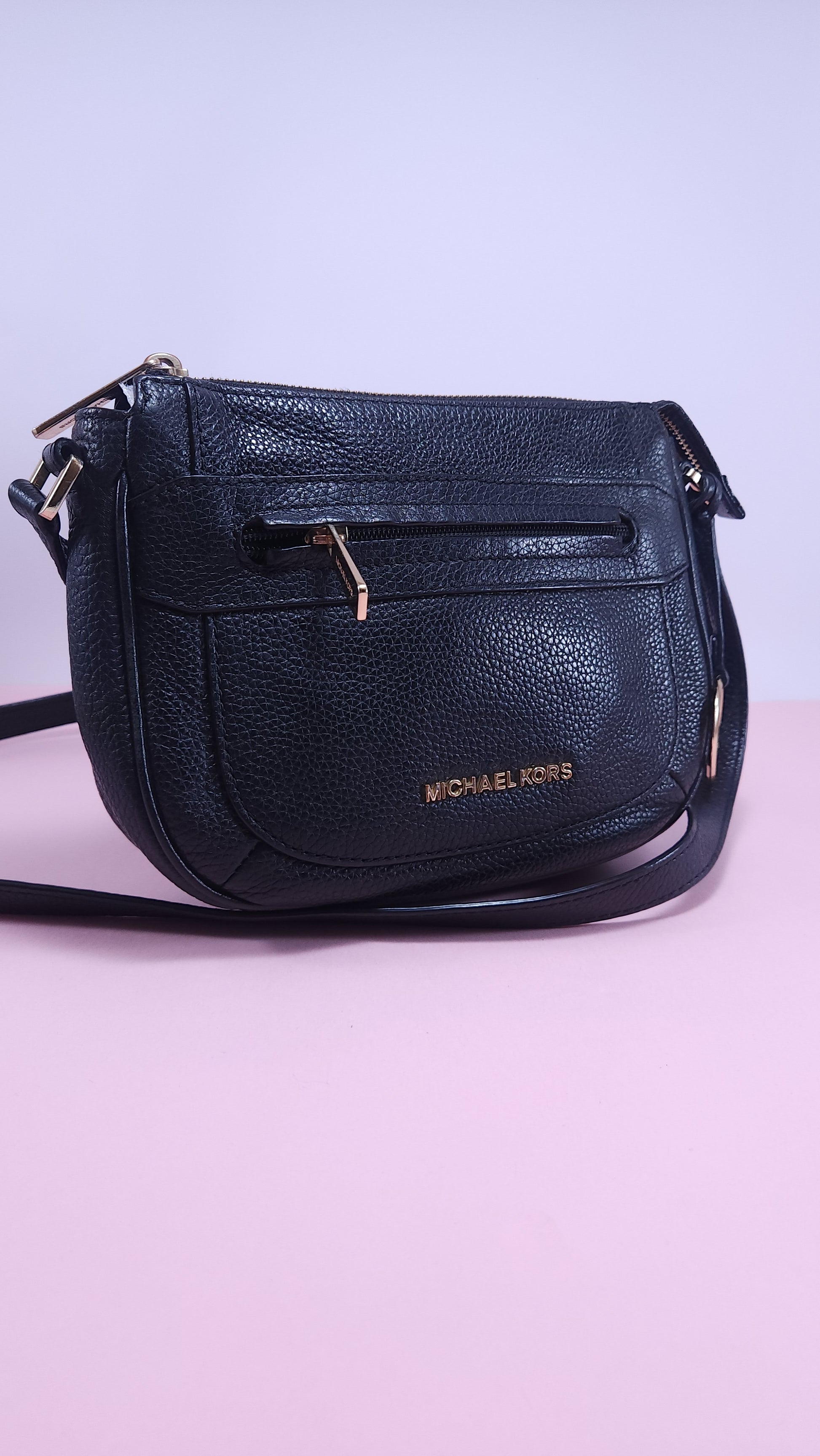 Bolso bandolera Michael Kors confeccionado en piel negra granulada de alta calidad, con herrajes dorados que aportan un toque sofisticado. Cuenta con bolsillo frontal con cierre, amplio compartimento principal con cierre de cremallera y correa ajustable para mayor comodidad. Interior forrado, ideal para llevar lo esencial con estilo y seguridad.