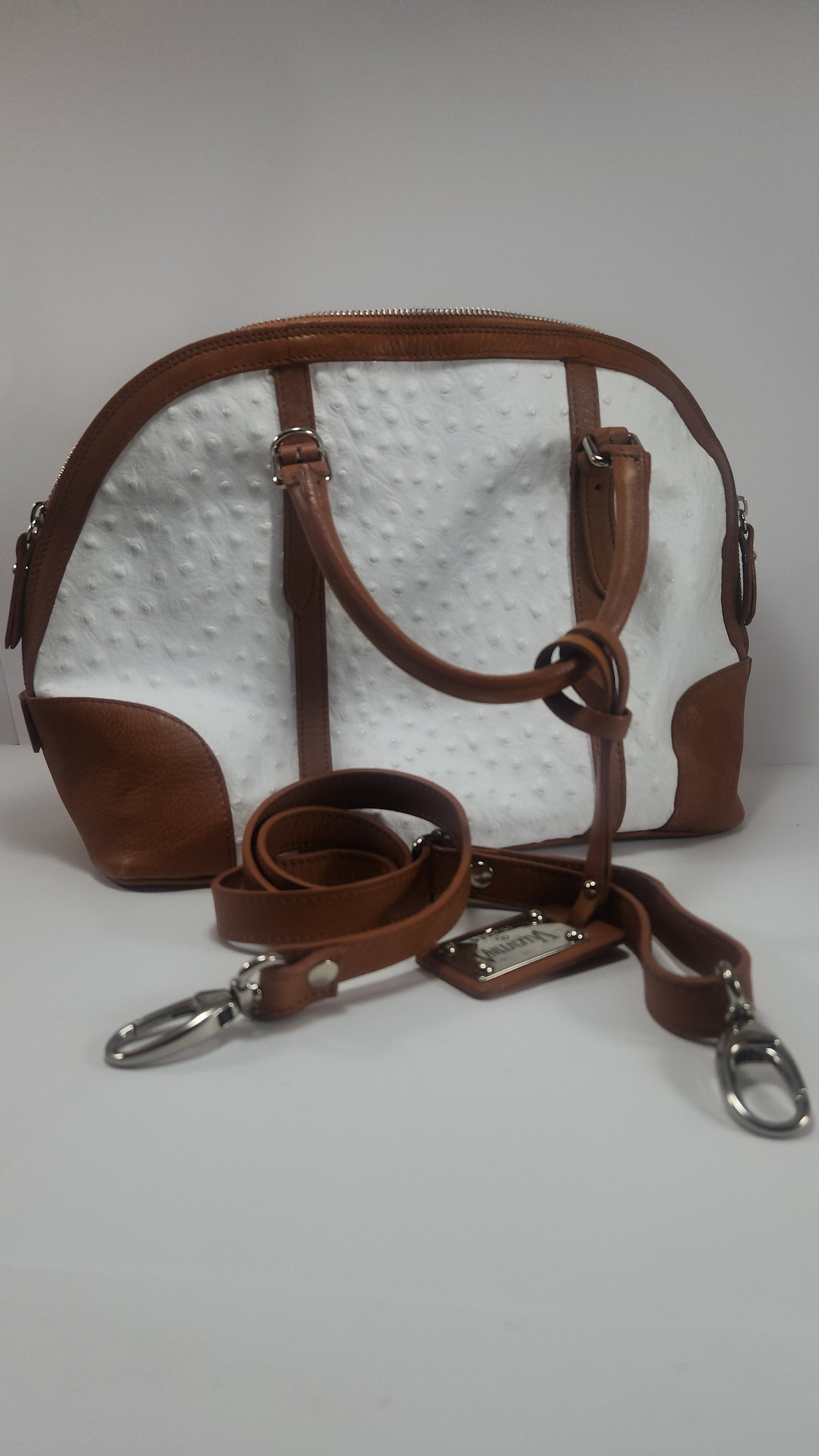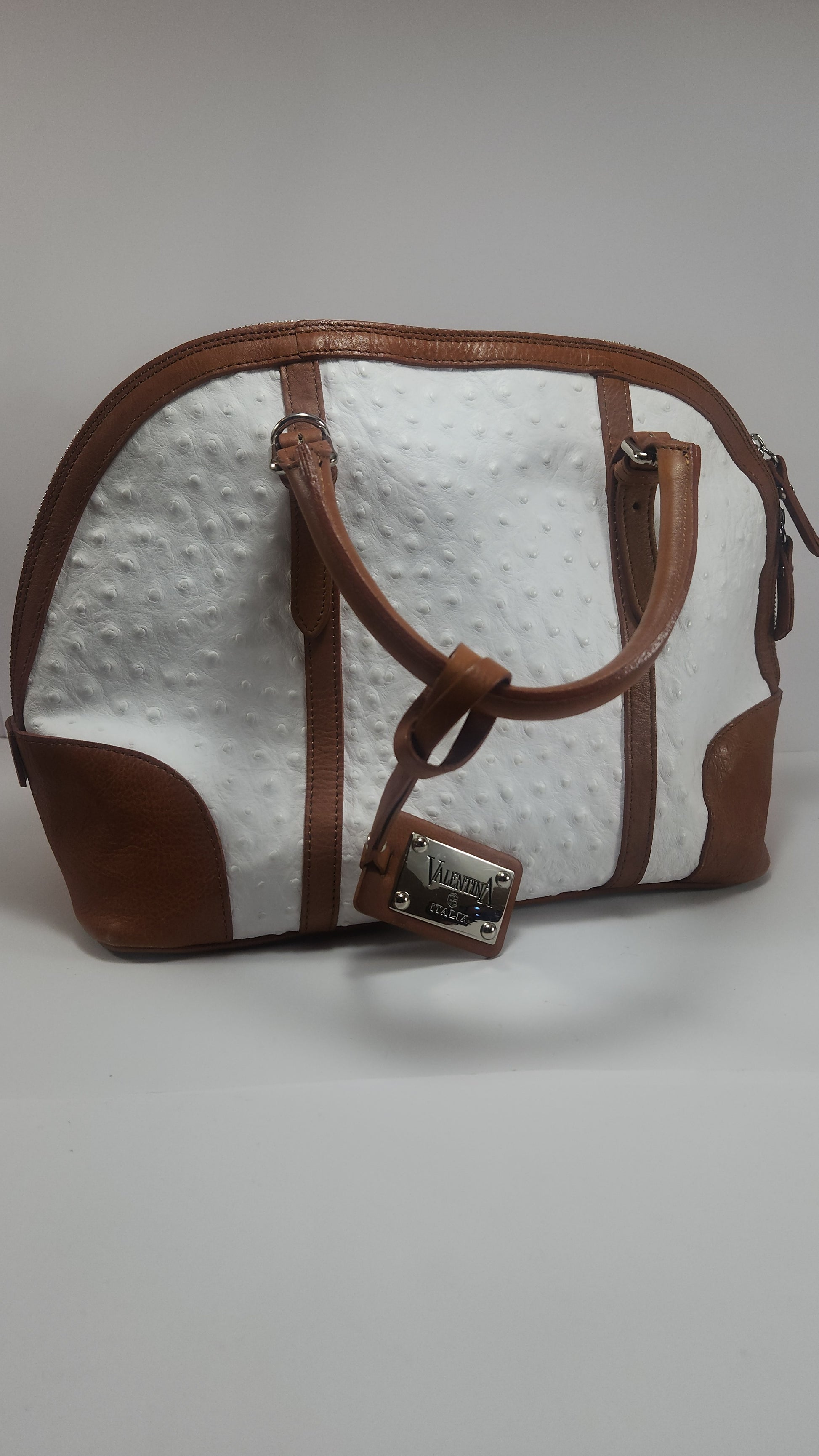 Añade un toque elegante y único a tu colección con esta sofisticada bolsa satchel Valentina, confeccionada en piel estilo avestruz en color blanco con acentos en café. Incluye asas cortas para llevarla en la mano y correa larga ajustable para mayor versatilidad. Su amplio interior la hace ideal para el uso diario o para complementar tus outfits más chic.
