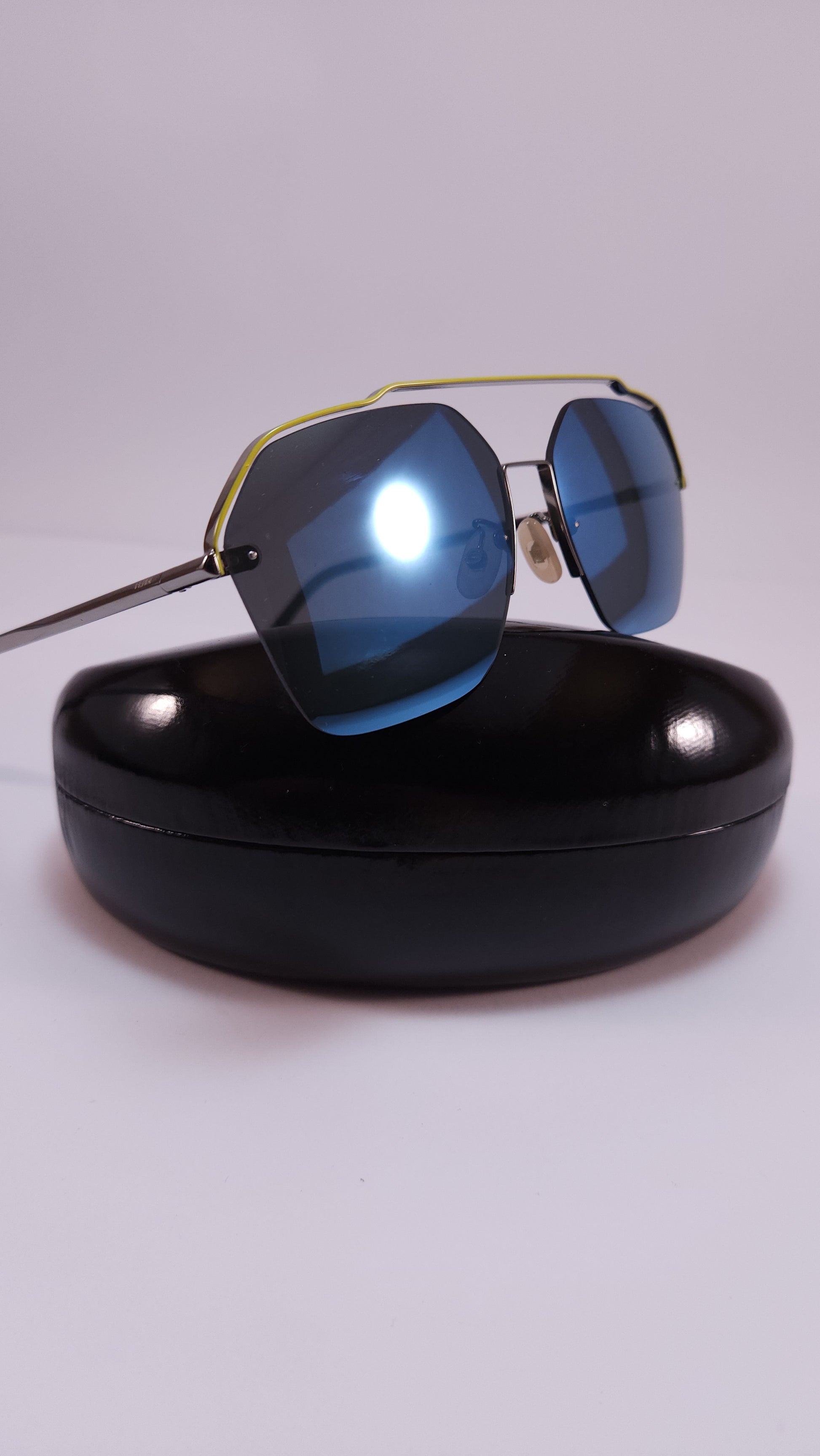 Atrévete a destacar con estos increíbles lentes de sol Fendi FF M0032/S, un diseño moderno que fusiona elegancia y audacia. Con estructura metálica plateada, detalles en amarillo que aportan un toque único y lentes espejados negros para máxima protección solar con estilo. Aunque no incluyen el estuche original, se entregan con estuche de protección para su cuidado.