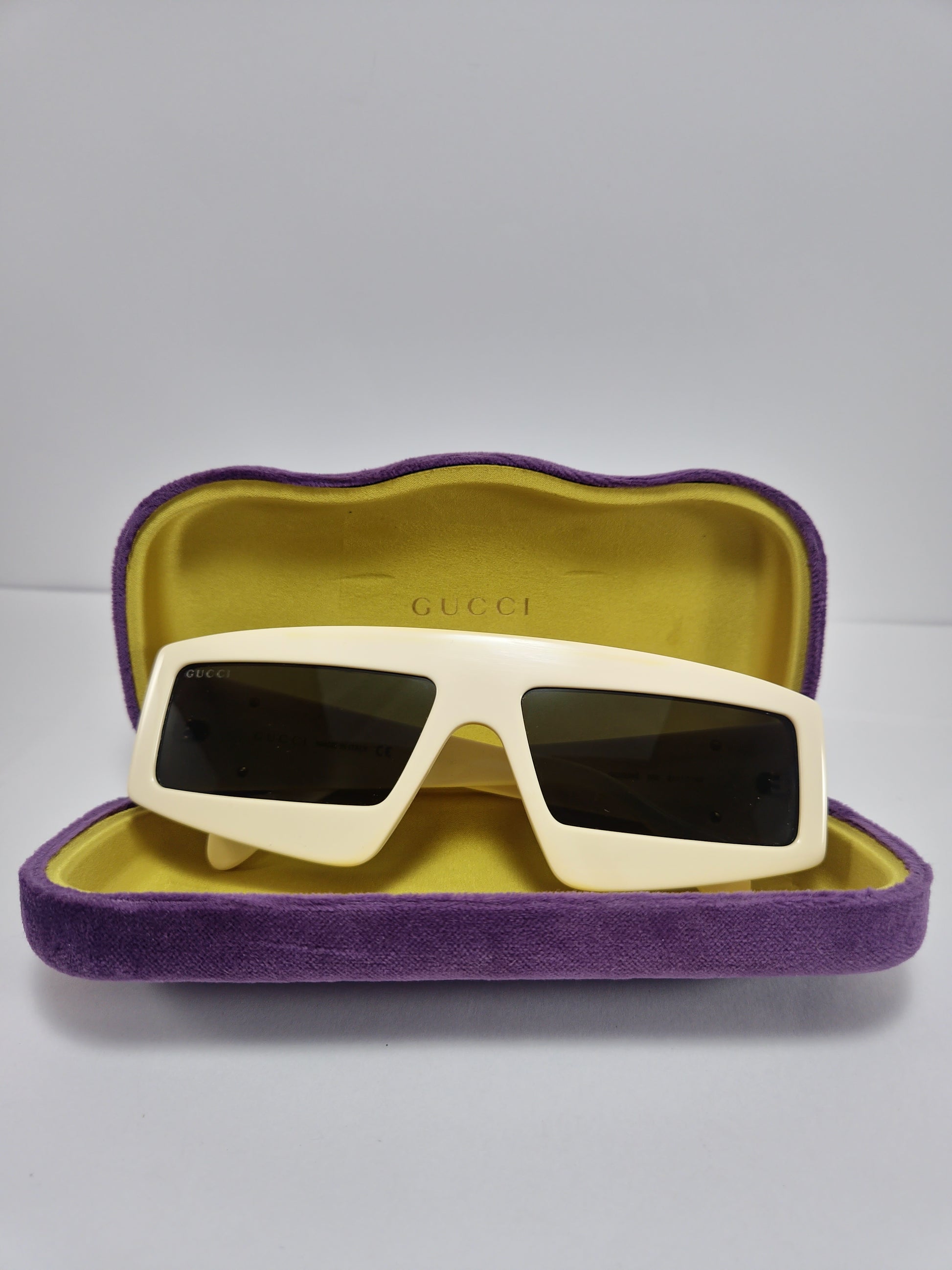 Deslumbra con estos icónicos lentes Gucci modelo GG0358S, en elegante color blanco marfil con el emblemático logo GG dorado en las varillas. Su diseño cuadrado oversized ofrece un look audaz y moderno, perfecto para quienes buscan destacar con estilo y personalidad.