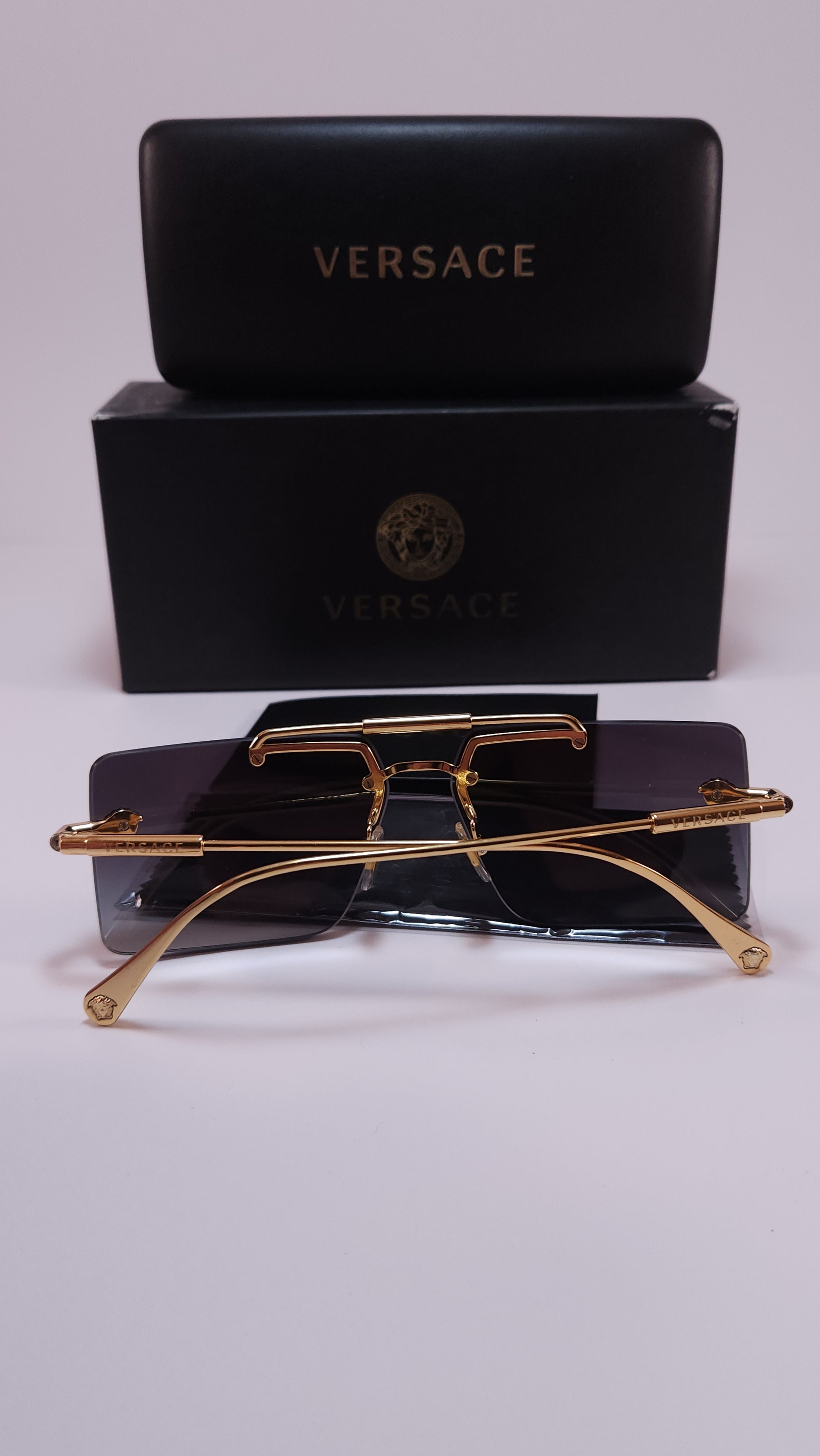 Lentes de sol Versace modelo VE2245 10028G, nuevos y originales. Diseño rectangular oversized con montura de metal dorado que aporta un toque de lujo y sofisticación. Micas en degradado gris a negro, con el icónico logo Medusa en los laterales. Un accesorio elegante y distintivo para realzar cualquier outfit. Incluyen estuche original Versace, paño de limpieza y certificado de autenticidad.
