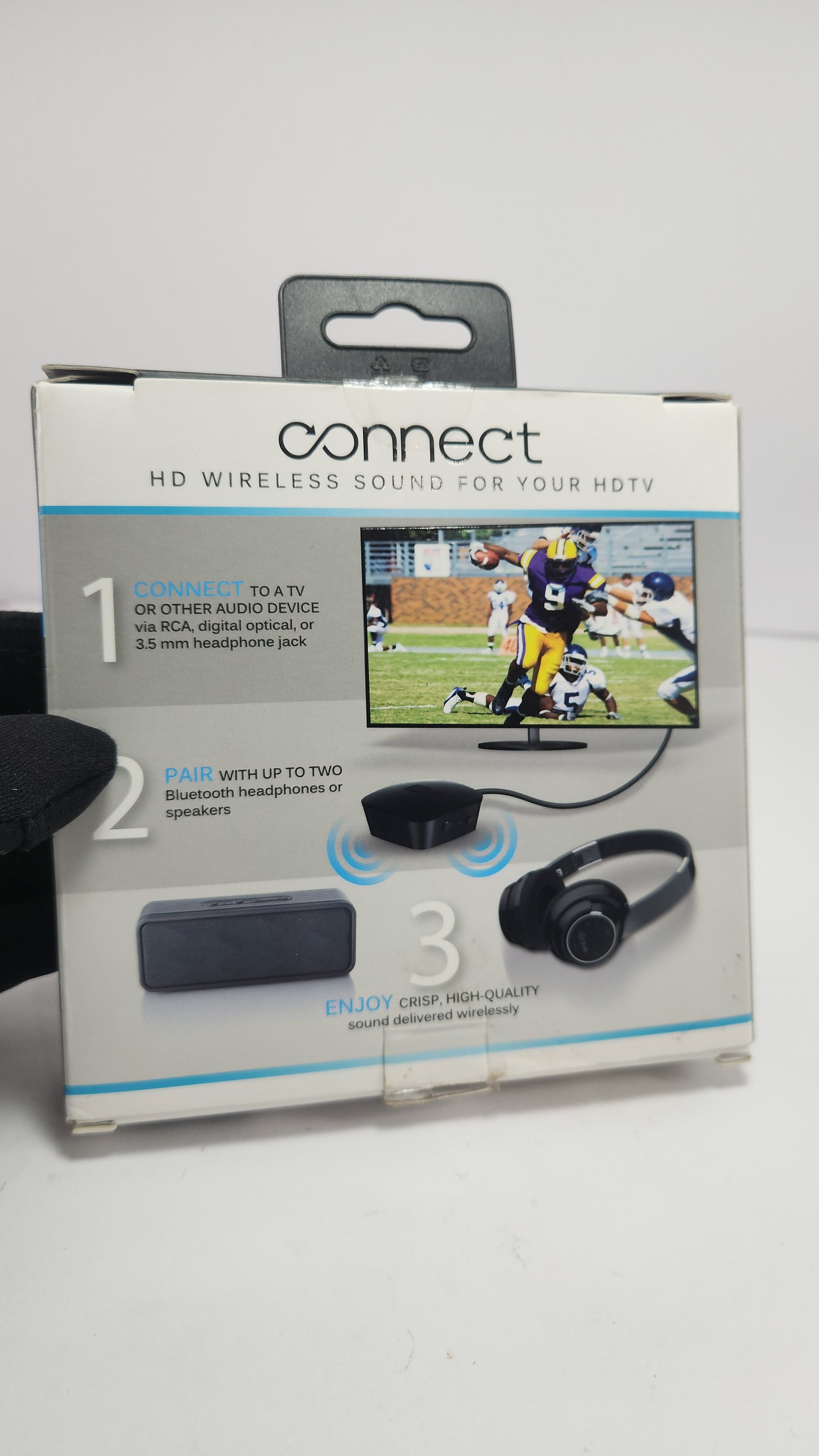 MEE Audio Connect, transmisor de audio inalámbrico Bluetooth universal. Permite conectar hasta dos audífonos o bocinas al mismo tiempo, ideal para usar con TV y otros dispositivos de audio. Ofrece sonido HD sin distorsión gracias a la tecnología Qualcomm® aptX™ Low Latency. Incluye batería recargable para uso portátil.
