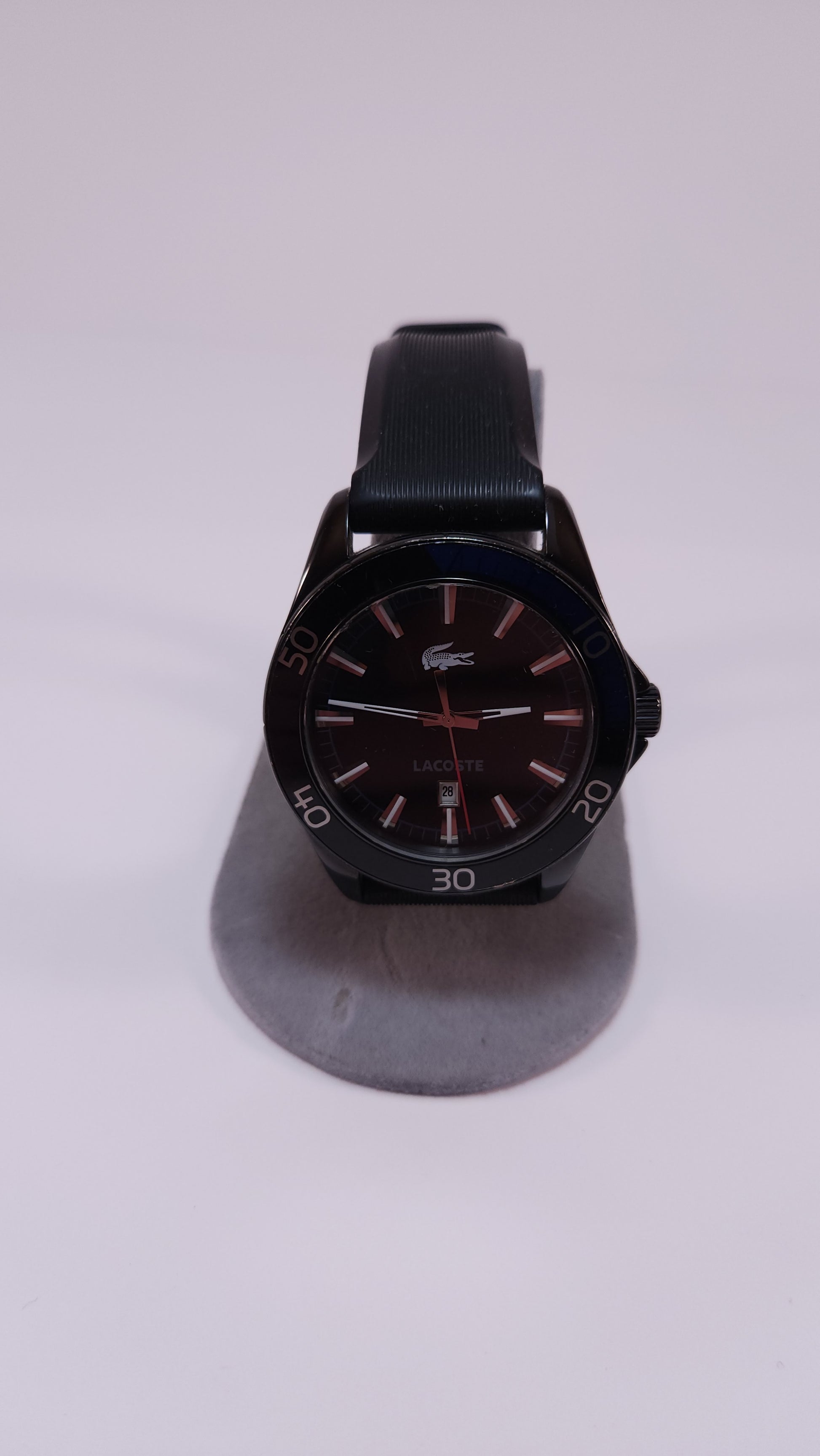 Este reloj Lacoste combina un diseño deportivo con un toque elegante, ideal para el uso diario. Su caja de acero inoxidable, correa de silicona negra y detalles en azul en el bisel lo hacen destacar, mientras que el logo del icónico cocodrilo le da el sello distintivo de la marca. Incluye fechador para mayor funcionalidad.