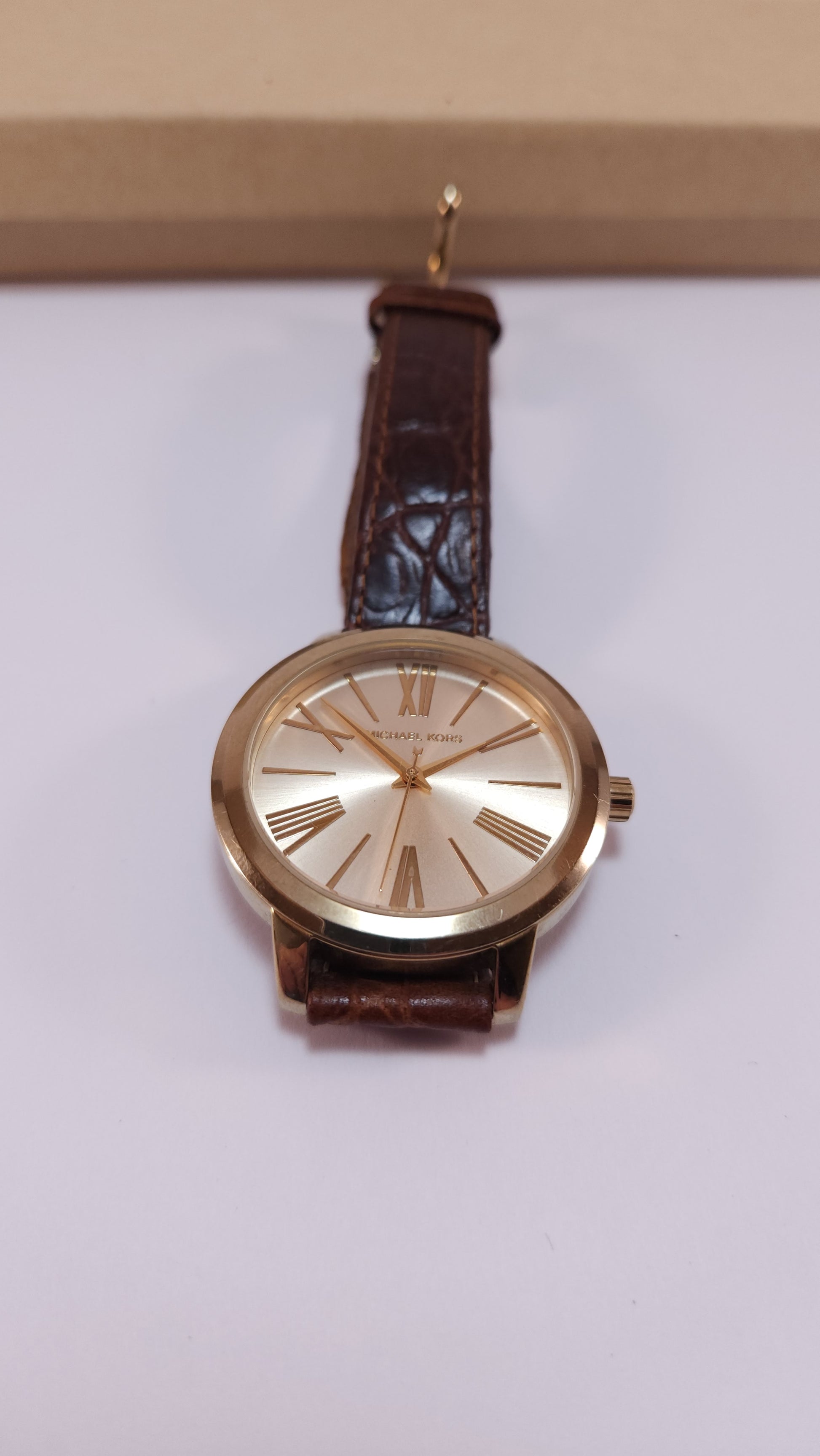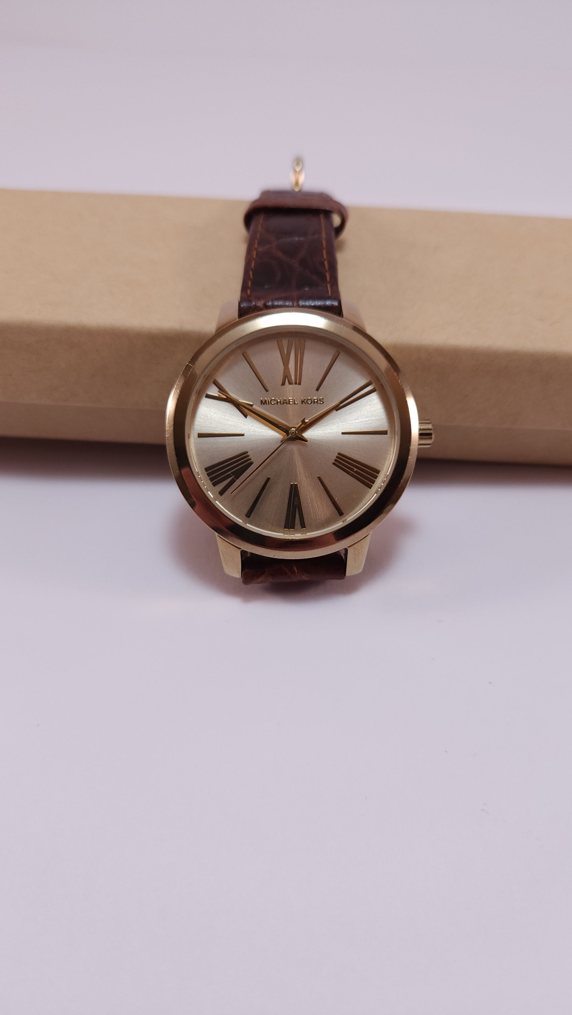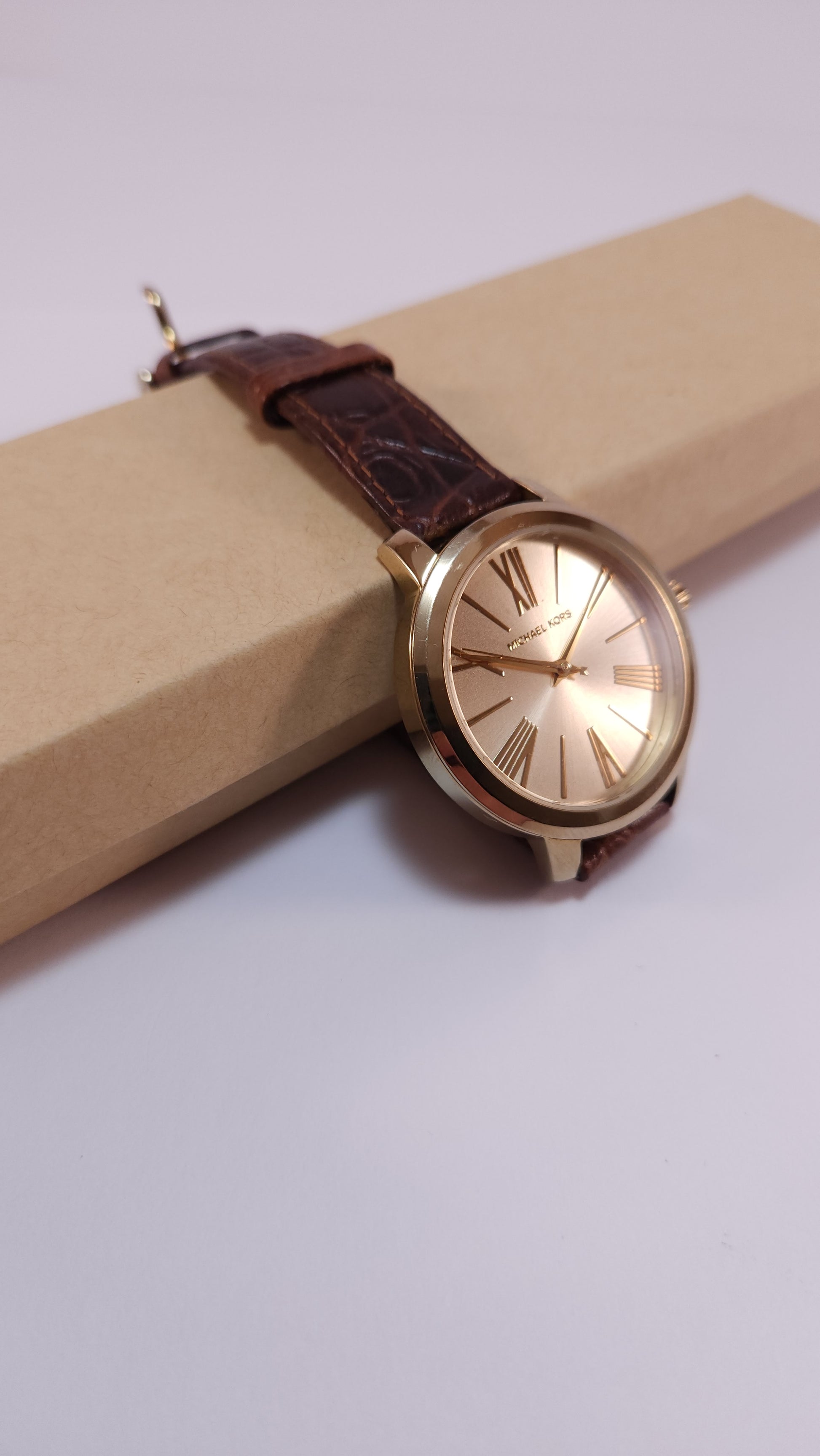 Complementa tu look con este reloj Michael Kors de estilo clásico, con carátula dorada y números romanos que aportan un aire sofisticado. La correa de piel en tono café con textura imitación cocodrilo le da un toque moderno y versátil, perfecto para llevar a la oficina o en ocasiones especiales.