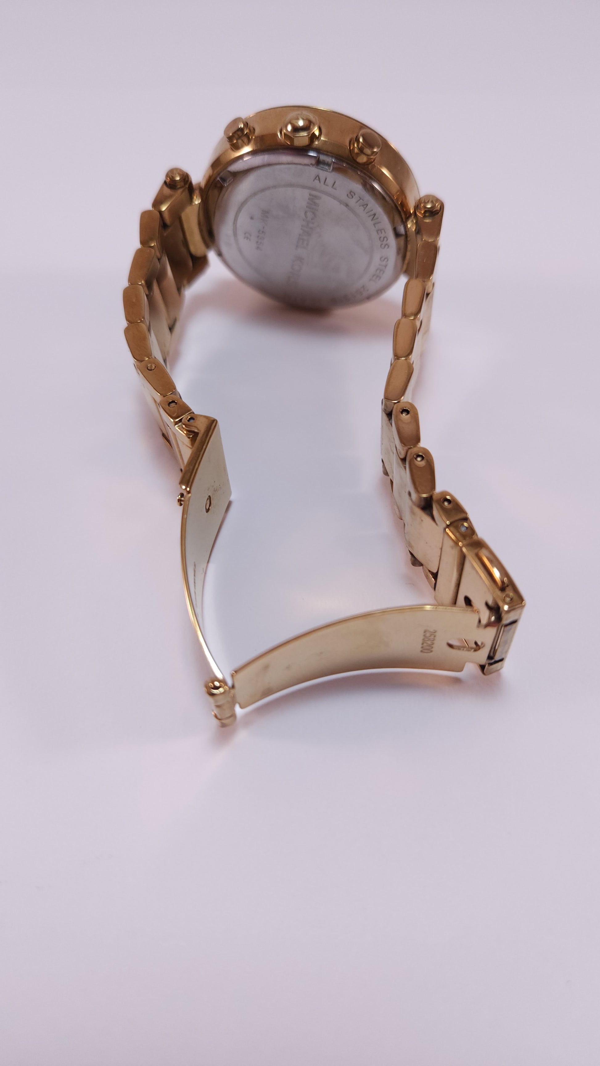 Dale un toque de glamour a tu estilo con este reloj Michael Kors en tono dorado, que destaca por su bisel completamente adornado con cristales y su carátula multifunción. Con cronógrafo, fechador e indicadores brillantes, es el accesorio ideal para lucir sofisticada y elegante en cualquier ocasión.